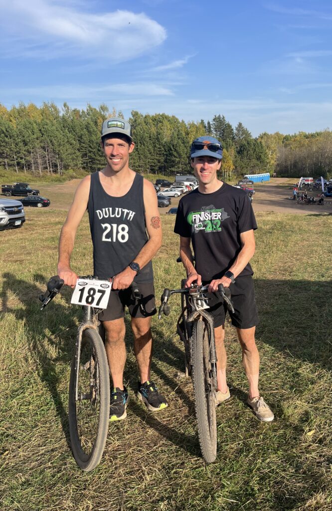 Across wide open gravel roads, passing the sporadic cyclist and one 100 miler, I was giving it all I got. I thought about how I was screwing up my Sunday NMTC trail running race the next day. DO NOT think about that, I forced myself. I couldn’t push any harder. My mouth was so dry and I chugged water from my bladder’s hose while nervously checking my watch. I told myself to just tuck low under the wind. I told myself that now was a good time to just give up because going under 6 hours was stupid and just some arbitrary dumb thing that didn’t matter and I wouldn’t make it anyways. NO! Just crank. So close, the pain is almost over with, I told myself out loud. Finally, I was so relieved to see the finish flags. I was shaky around the first turn, with soft gravel under my wheels. One more slow turn. I was visualizing, expecting, hoping, doing whatever I could to turn the corner and see 5:58:XX on the clock, and was utterly defeated to see 14:03:XX on the clock. GAH, time of day?? Cmon… I rode through, utterly spent, giving it all I had to try to go under 6 hours at Heck of the North. I stopped my watch and dropped my bike, whipped my glasses and helmet off and slumped to the ground. Raising my battered wrist to my face, I saw 6:00:05 on my stopped watch and couldn’t take it. AW NAW!! Cmon!! I fake cried. I was being overdramatic, writhing on the ground. Eventually I collected myself, calmed down, and made my way to the race timer. Conor said my time was… 5:05. What?? No. I told him that was wrong. He looked at me confused. I said it wasn’t right. He said, er um, he was having issues… let’s see, he said um er, my chip time was… 4:59:56. Hell yes!! Nick got second place and was pleased with his race. Dave came in a few minutes behind me, Rhonda killed it with 5th place and after the dust settled I was shocked and pleased with how my race went. It was so painful, but also fun and inspiring to feel good throughout the whole race and finish really strong. I attributed that to Superior 100 setting me up fairly well for brute strength, continuing to tune in my liquid-only fueling strategy, and being smart in the pack through mile 80. Heck was a great experience and is in my opinion the perfect 100 mile gravel bike race course.