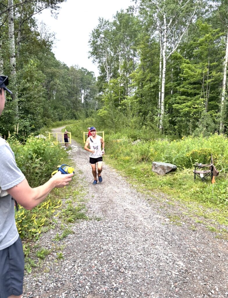 Once I ran away from the Beck’s aid station, down the paved Munger Trail a little bit and into the woods onto singletrack, I got into a nice groove. It was slow, it was hard, but I was at least running. I had a burst of positivity – I was going to finish this thing. I passed the crux. I was running, just chugging along. If the tiniest hill came, however, I could justify walking. If I felt hot, I justified walking. I got into a bad habit of walking, clocked a 15 minute mile, thought that I was dealing with the worst despair possible. The mountain bike trails were killing me. At Mission Creek I got fully down on a rock and splashed water all over my face. I slowly got back up and got back to running. It took a bit to get the legs churning. The smallest deviation in the trail would cause me to slow down immensely. Log over the trail, staircase, slight uphill, or just the feeling of being completely sapped of energy. I was already conserving my handheld bottles. If I had been drinking to thirst they would have been gone. I tried to remember how many miles it was to the water-only aid station. 7? Ugh, I figured that left maybe 5 miles? At this pace, that is… an hour or more? I wondered if it’d be stupid to drink all my mix in half the time I was expecting to. I had no desire to the eat the gel I had planned on taking. I figured I could gorge on water, then fill up my half-gone bottles with water and slug that down before the Peterson’s aid station. The miles went slow. I was passed near the seven bridges road section. The trail seemed muckier than the morning. The dude ran out of sight quickly. The sun was so hot. I was not feeling good. I stopped to splash water on my face at both water crossings. Miles were so far out of the galaxy of what I planned, or was running on the way out. But, I was able to keep moving consistently besides splashing water on my head at creeks. I just wanted to get to the aid station for some actual relief. I thought about dropping out at Jay Cooke with my crew there. That’d be stupid, I thought, wouldn’t it? Drop out with three miles left? I kept chugging along and eventually got to the water-only aid station at Hwy 210. It was glorious. I got water in my bottles and drank several cups. I got ice in my hat and made my way back onto the trail. The ice hurt my head, and I’d try to carry my now full bottles in one hand while my hat was in the other hand. Then I’d take ice with my fingers, shuffle everything around, slap my hat back on and rub ice all over my arms and neck and forehead with the one hand. I tried to do this while running so slowly. I had no ability to push. The ice got shuffled around my hat and eventually melted or fell to the ground. The relief was fleeting. I could feel that throbbing sensation in the forehead signaling overheating. A creek was a godsend, but the hike back out of it would negate any mitigation of my fatigue. I was in no man’s land, wondering when Storkamp and the rest of them would pass me up one by one, just like Curnow 2023. Eventually, I found someone walking slower than I was. I didn’t feel the hunger of competition, I didn’t really feel anything. Empathy, maybe? I asked if they were OK. He responded like he wasn’t OK… he said “ahh, well, yeah” or something. I went on my way and he was out of sight in no time. I wondered when the next aid station was. Was it, 7 miles between them? If the last aid station is at mile 47, it was like, 4 miles between that one and Peterson’s? I couldn’t remember. If it was 3 miles from the finish to Jay Cooke, then 4 from there to Peterson’s, that’d be mile 43. If it’s a 50 mile course. I tried to run math, and figured I had at least an hour. It was devastating. I knew I had to go over the mini-powerlines, so I looked forward to that. I thought about how brutal the old powerlines were on the way back. That was fun, I thought. This was fun, I said to myself. I told myself that we should do this every year.
