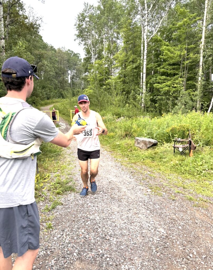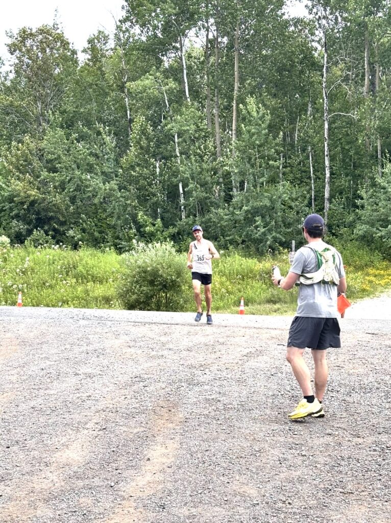 My first bottles had caffeine in them and I was sipping away nicely, right on track as I planned it out. After the first turn off onto singletrack trail, the Gill Creek Trail, I was in a nice group with a guy with long hair, local runner Matt and local Moose Lake area runner Nick. I had been following Nick on Strava for years probably, but never met him in real life. The caffeine was hitting, I suddenly felt talkative and we struck up some good conversation, mainly about a canoe paddle that he was carrying named Pierre. I was yapping away and missed two turns in rapid succession as Nick corrected me, then dropped his paddle Pierre off at Grand Portage to pick up on the way back. Matt had to pull over to poop and eventually I found myself alone. I ran directly through the first aid station, with all the carbs and liquid I needed in my hands. I was right on track taking down half of my two bottles each in the first hour. Sipping mix out in no man’s land. I was drinking the second half of my bottles pretty quickly and started thinking of the next aid station which was water only. I figured I ought to take my gel and fill my bottles back up halfway. When I arrived, they had a huge cooler of ice. I took a scoop of ice in my hat, ate a gel and filled my bottles up a bit. The Mission Creek area was super fun and I was right on track, about 10 minutes up on my time and doing pretty good with 10 minute miles. I truly had a hard time believing that I’d be able to keep up the pace all day. The negative thoughts started creeping in as I got close to my first crew stop at Beck’s. The gap between the Beck’s Road aid station would be the crux of the race, I told myself. Brace yourself! I reminded myself that I had to keep good pace through the middle section of the race, and if I was feeling decent at Beck’s on the way back I’d be sitting pretty for an 8 hour finish. I saw my brother and sister right away and swapped my bottles. I didn’t take anything from the aid station, just zoomed off. In and out, just like the plan. I was efficient, and probably passed a few people right then and there.