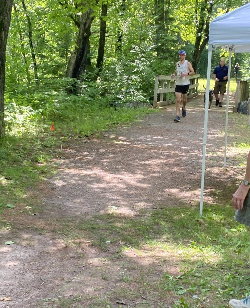 I knew there were a lot of easy running trails to bring it into the last aid station Jay Cooke right before the swinging bridge. I tried pushing a little bit on the flat horse trails through the State Park. This is all mental, right? I can control my situation right here, I told myself. However, when I tried to push a little bit and get my legs moving and some speed going, I felt like my heart was beating out of my chest and I couldn’t catch my breath. Oh jeez. Not good. I guess a 12 minutes per mile shuffle will have to do. It was the heart of the afternoon while running through the lightly shaded and breezy ski trails of Jay Cooke State Park, and felt like the true heat of the day with a forecasted heat index over 100 degrees. It was so stinking hot. The ice in my hat melted away eventually, and the grape squincher drink in my bottles that I was still just grasping in my hand had turned warm. It was nice to have plenty of fluids, however. It was also nice to feel like I was getting close to a familiar landmark, and I eventually ran over the Forbay dam and saw another runner off in the distance. Blood in the water. I tried to visualize catching up to the person and it was hard. I was so fried. I had made a horrible mistake not getting water at the zoo turnaround and I was still paying for it. I was moving, however, and hadn’t been passed except one time pretty much from Ely’s Peak. I figured I was 12th or 15th place, somewhere in there. Getting closer to the swinging bridge, I could feel it, and I made the pass on a guy walking. He almost caught up to me as he started back running, and that was all the motivation I needed to not feel utterly compelled to walk. I kept up the running stride, no matter how slow and clunky. I knew the aid station was close, and I needed it. I felt that I had almost nothing left to give. As much as I should have nearly run straight through the last aid station, which was absolutely my plan from the start, I told myself I could take as much time as I needed. Around a corner, someone standing. Yes. A little further, the HAM radio operator collecting bib numbers to report to the headquarters. Yes. I saw my brother Andrew ready with the bottle. My sister Emily wasn’t around, and when I got to him I dropped to my knees. A volunteer exclaimed “oh” in a concerned tone. I’M FINE. I wasn’t fine. The last three miles seemed unachievable. But, I just had to keep going. I splashed water in my face, got completely wet with cool aid station water, grabbed my handheld and gave Andrew my two bottles, and shuffled off. I looked like hell, and all these state park patrons were just trying to have a nice afternoon without this raggedy dude trying to slip past them. I made good time across the swinging bridge, onto the most rugged, technical trail of the course. Perfect. Let’s go. I wondered if I’d come back to pickle shorts guy…