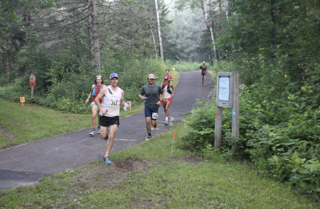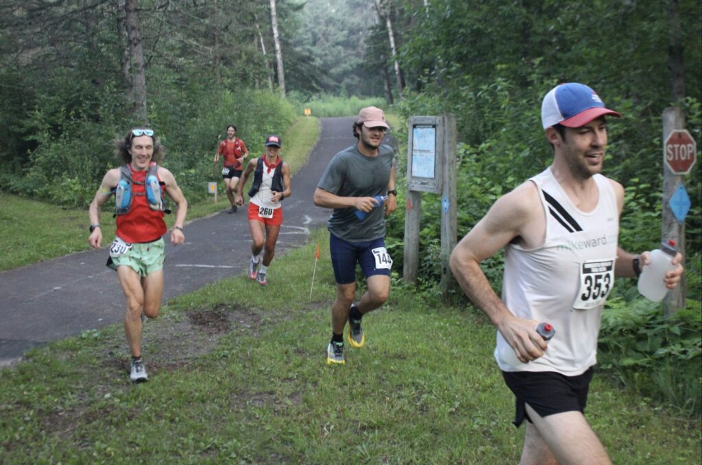 I had two big bottles awkwardly cradled in each hand and the front runners took off sprinting. I was in the mix, maybe about 10 people back. It was a beautiful morning with a purple and orange aura ahead as we ran due east, the low sun blending with a mix of wildfire smoke and thick, moist and misty air. The first three miles of the race were on a paved path, and I knew I could rack some early quick miles for a nice time buffer, then my race plan was to lock in at just under 10 minutes per mile. That’d get me to 8 hours. I really like pacing ultras with the miles per hour strategy and today I wanted to hit 6 miles per hour. After the first hour of steady jogging, I was up to 7 miles. So, I was about 9 or 10 minutes ahead of pace after an hour. After the pavement, we entered flat horse trail – easy running on the north side of Jay Cooke State Park. I was around quite a few people, and we were jockeying for position – some people zooming ahead, some people falling behind a bit. I didn’t feel like striking up a conversation and was kind of hoping nobody would talk to me for whatever reason. It felt like it was a lot of work to chat. Nobody around me was blabbing… I heard few voices off in the distance but I was able to just get in my zone and click off miles.