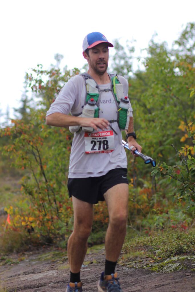 We stopped at Caribou and anxiously waited in the drive-through for the coffee to brew or something. It seemed like an agonizingly long time but we were on the road without too much trouble. The internet map predicted we’d be at Gooseberry around 7:15am, which was relieving. And, the internet was right. We found a very convenient parking spot and I quickly got bib number and three Pacer bibs. A few people asked me if my mom was here. Yes! I said she was here in person! That was so nice to hear. She hadn’t been able to run or race recently and was booked for a second hip replacement surgery the week after Superior. I enjoyed getting the sense that my mom had left a similar impression – support, joy, camaraderie – on other runners as she had on me. I got through the bathroom line quickly and was ready to roll in no time. As I waited to get to the start line, I circled back to my van to make a decision on my clothes. It was kind of chilly, there were a lot of puffy jackets at the Gooseberry visitor’s center, but I knew it’d heat up before long. It was 20 miles before an aid stop. I figured layers were always a good choice and started with a thin long sleeve tech shirt, the same jersey I wore in 2017, and running shorts. I had my Nike trail shoes on, which I ran the entire Voyageur 50 miler in. That race caused me a bit of a tender spot on one toe and I had cut the shoe to provide a little relief. I decided to start with my trekking poles and running vest.