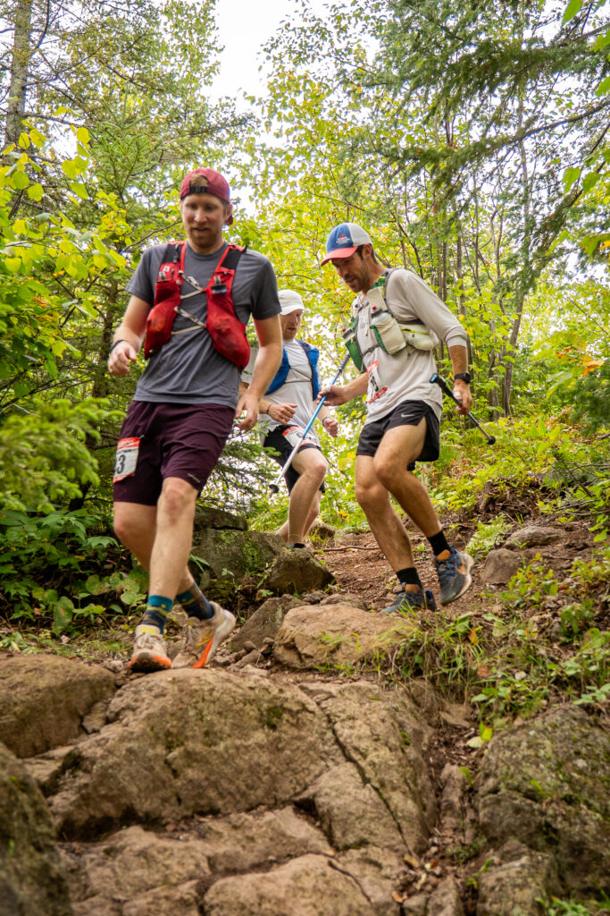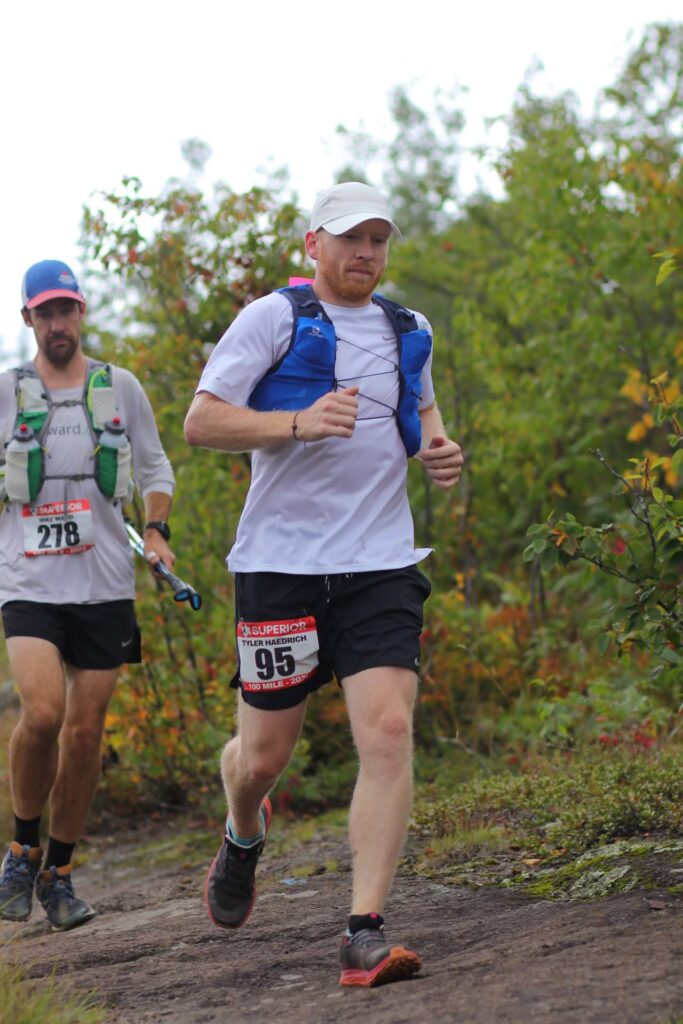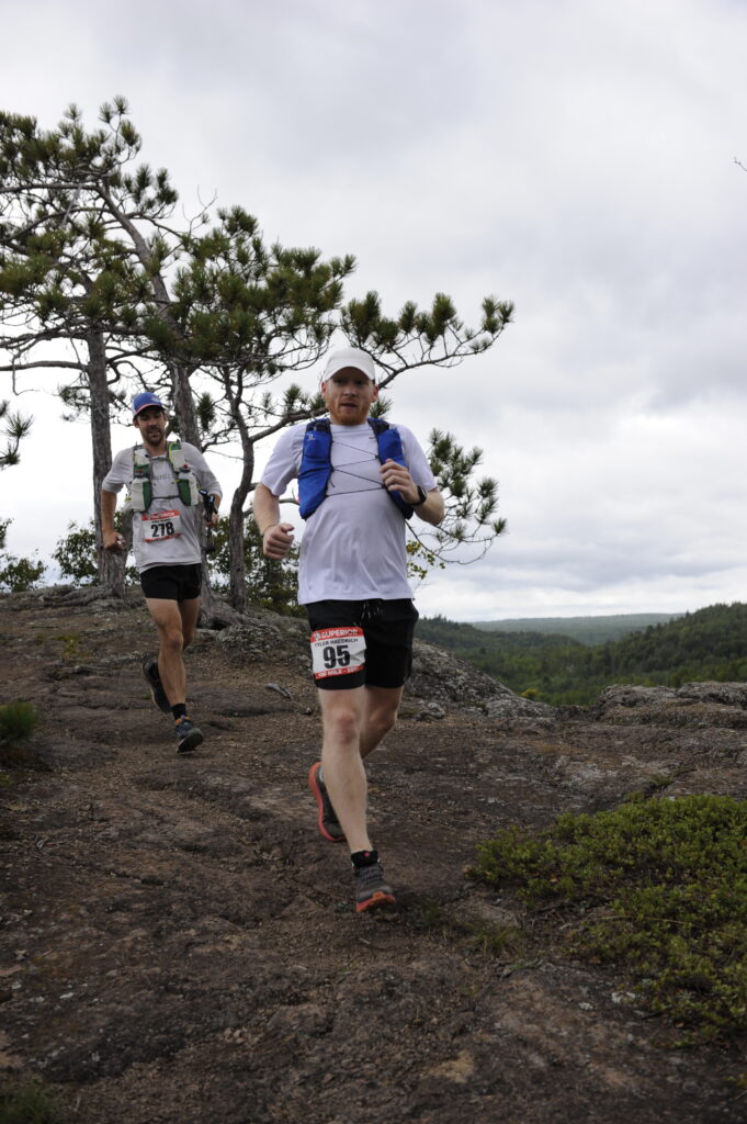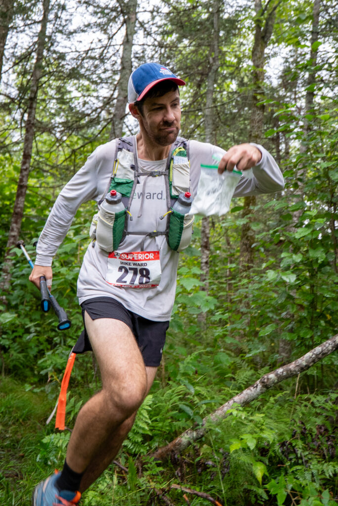 Crews, spectators and volunteers were everywhere! It was incredible. I scanned the crowd and found my mom’s waving arms quickly. I went to her, and my dad had all of my stuff well laid out. I said I just wanted the mix and was out. I grabbed it, filled up with water, sipped a little water and was out. I put the two bags of mix under my hat and two backup baggies on each hip in my vest. In no time at all, I ran out to the sounds of a roaring crowd. It was exciting. There was a light mist in the air and I was very comfortable in my clothing choices. Before running too hard, I lifted my hat, tried to carefully pour two scoops of mix into each full bottle of water and get the caps screwed back on. It worked OK, but it took a while and even a slow walk was too unsteady to pour the powder from a baggie with accuracy. I planned to fill my second bottle on the singletrack and ran the easy gravel while I had the opportunity to speed up a bit. Tyler came barreling down the gravel road hill towards the Beaver River and we set back off. I told him I really wanted to lock in at 4 miles per hour and that the punchy climbs between Beaver Bay and Silver Bay were slower than the fast runnable trail that we’d been enjoying all day so far. It didn’t work well, we were fast. Tyler stopped to pee quite a bit and I just kept steadily chipping away while he caught up.