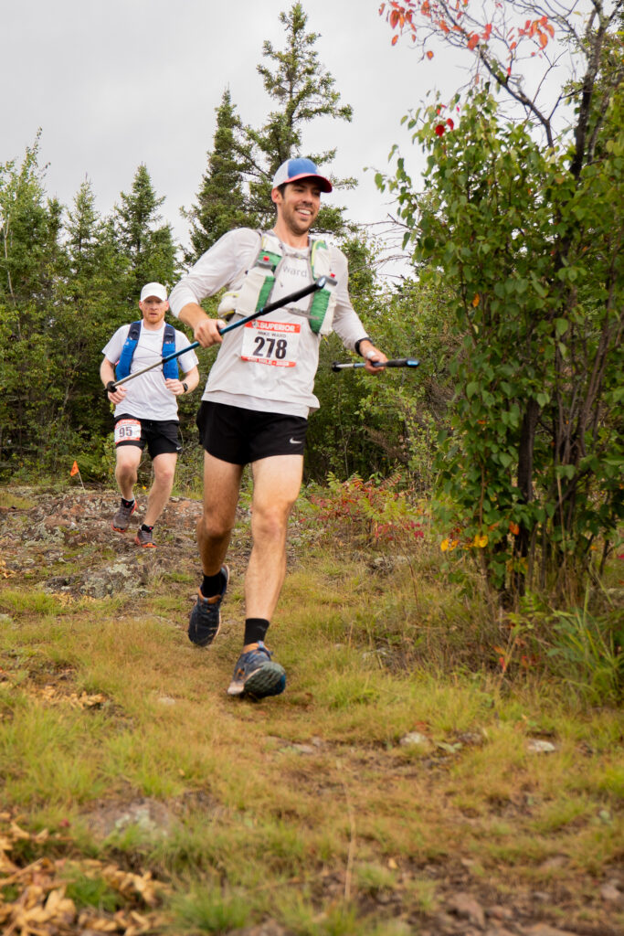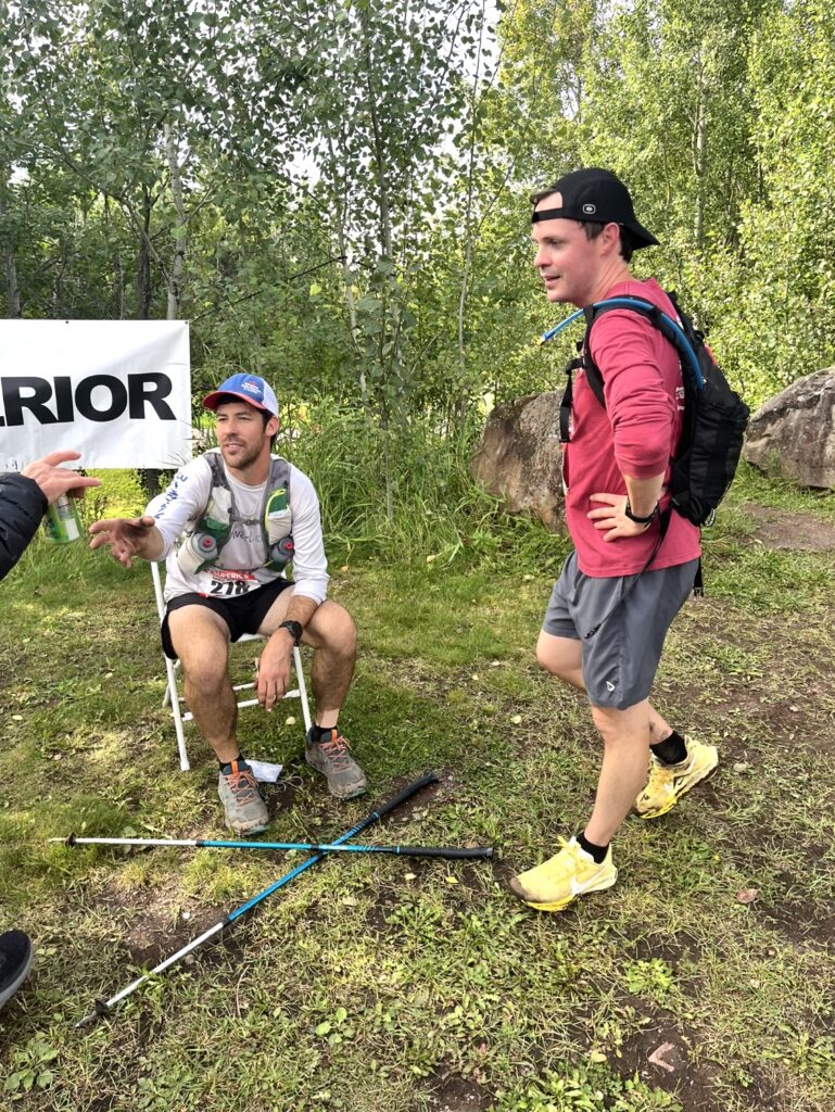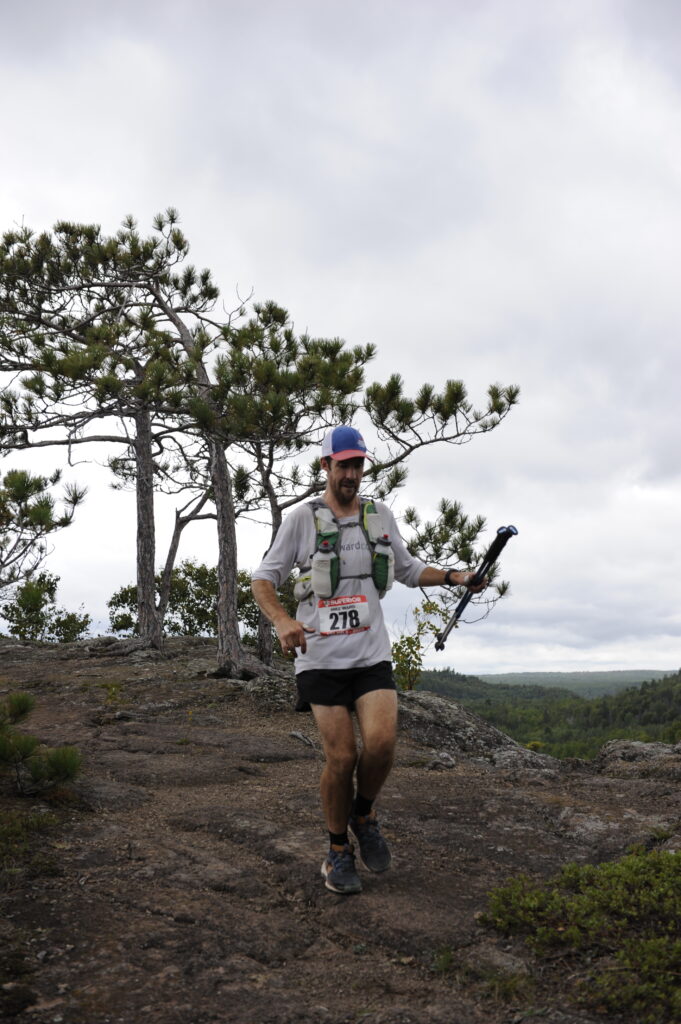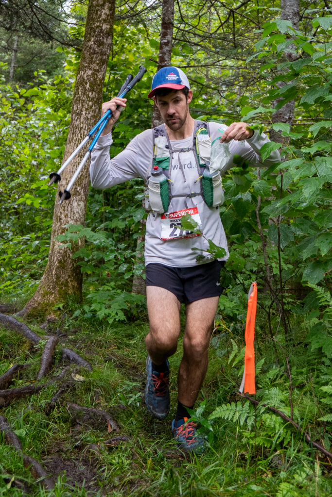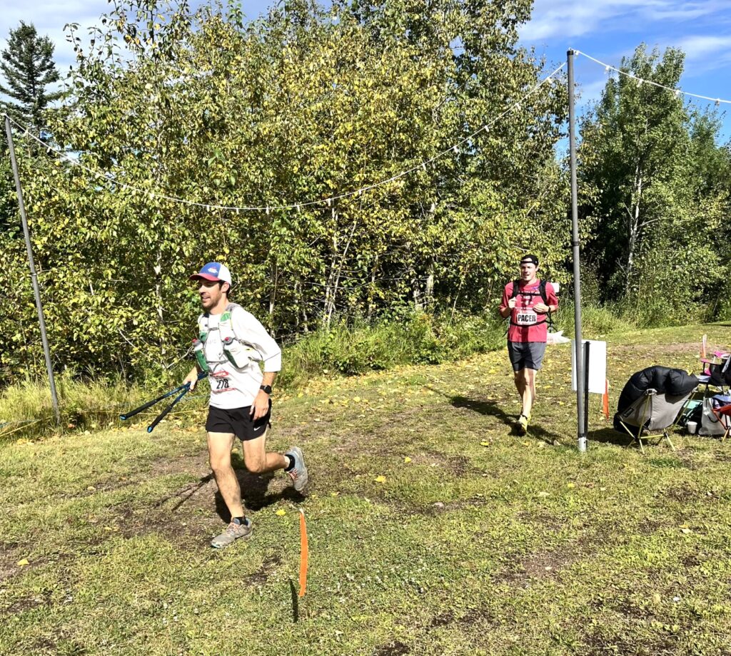 I was planning to take a little stop at the Silver Bay crew stop, and switch shoes from my Nike Pegasus Trail to big Mizuno tanks. Taking the poles and running vest from the start seemed to be a good idea, although I noticed that I was developing hot spots on my palms. Pre-race, I had generously applied KT tape on known hot spots like my collarbones and inner thighs and I seemed to be doing great from a chafing or blister standpoint. On the ridge high above Penn Boulevard, Tyler and I were running together plotting our next moves. The aid station came in no time, 25 miles down and I was so excited how fast 1/4 of the race flew by. I found my parents, sat in a chair and got my shoes changed. My first pacer Justus was there with a pitcher of water in hand. He told me very flatly that I was going too fast. I had texted him earlier that if I’m way ahead of my time at Silver Bay (knowing he’d be volunteering there), to yell at me. I was way ahead of my time, Justus fake scolded me in the lightest way ever, but I would have discounted any comment delivered in any way. I was right where I wanted to be.