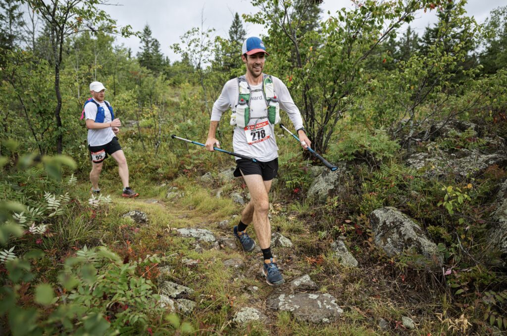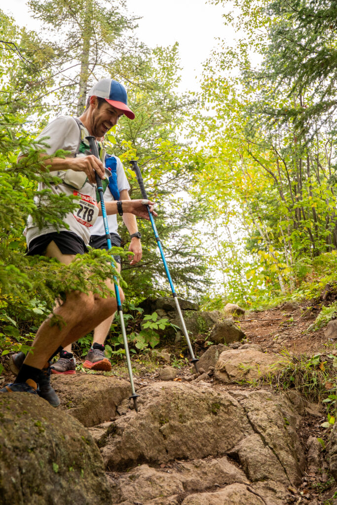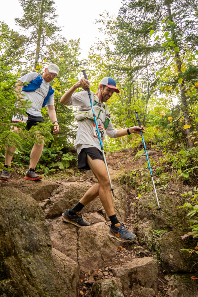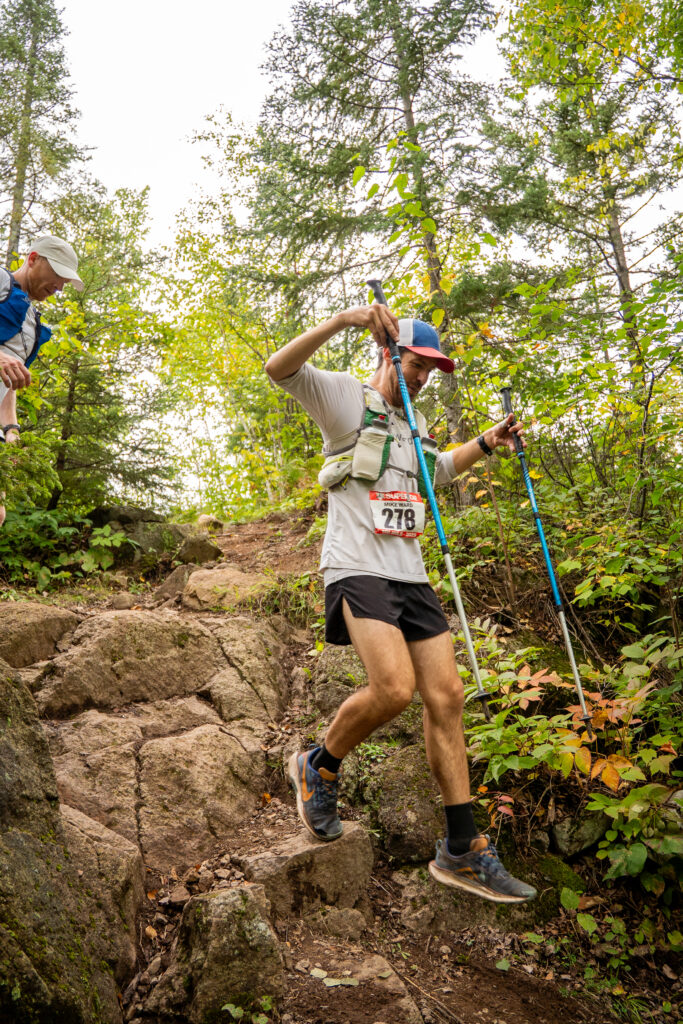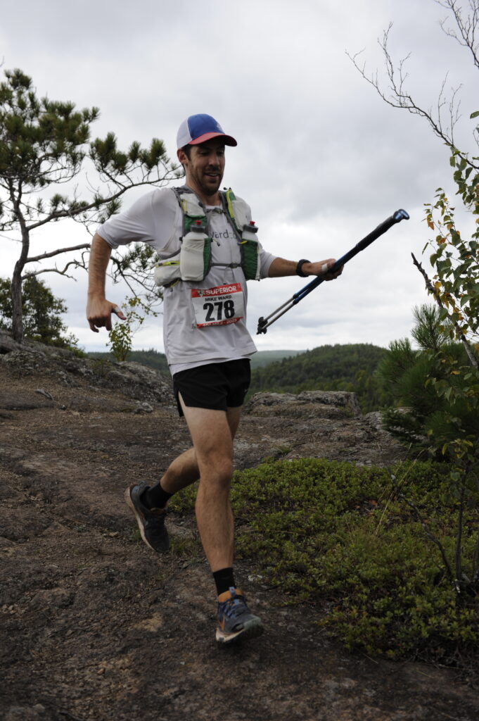 I was planning to take a little stop at the Silver Bay crew stop, and switch shoes from my Nike Pegasus Trail to big Mizuno tanks. Taking the poles and running vest from the start seemed to be a good idea, although I noticed that I was developing hot spots on my palms. Pre-race, I had generously applied KT tape on known hot spots like my collarbones and inner thighs and I seemed to be doing great from a chafing or blister standpoint. On the ridge high above Penn Boulevard, Tyler and I were running together plotting our next moves. The aid station came in no time, 25 miles down and I was so excited how fast 1/4 of the race flew by. I found my parents, sat in a chair and got my shoes changed. My first pacer Justus was there with a pitcher of water in hand. He told me very flatly that I was going too fast. I had texted him earlier that if I’m way ahead of my time at Silver Bay (knowing he’d be volunteering there), to yell at me. I was way ahead of my time, Justus fake scolded me in the lightest way ever, but I would have discounted any comment delivered in any way. I was right where I wanted to be.