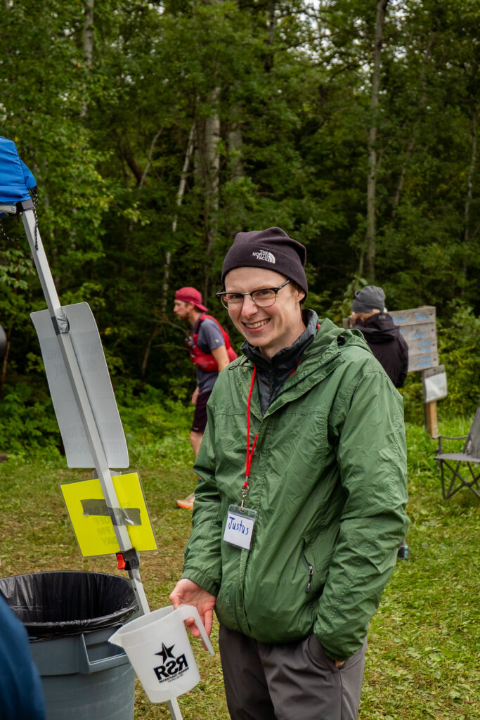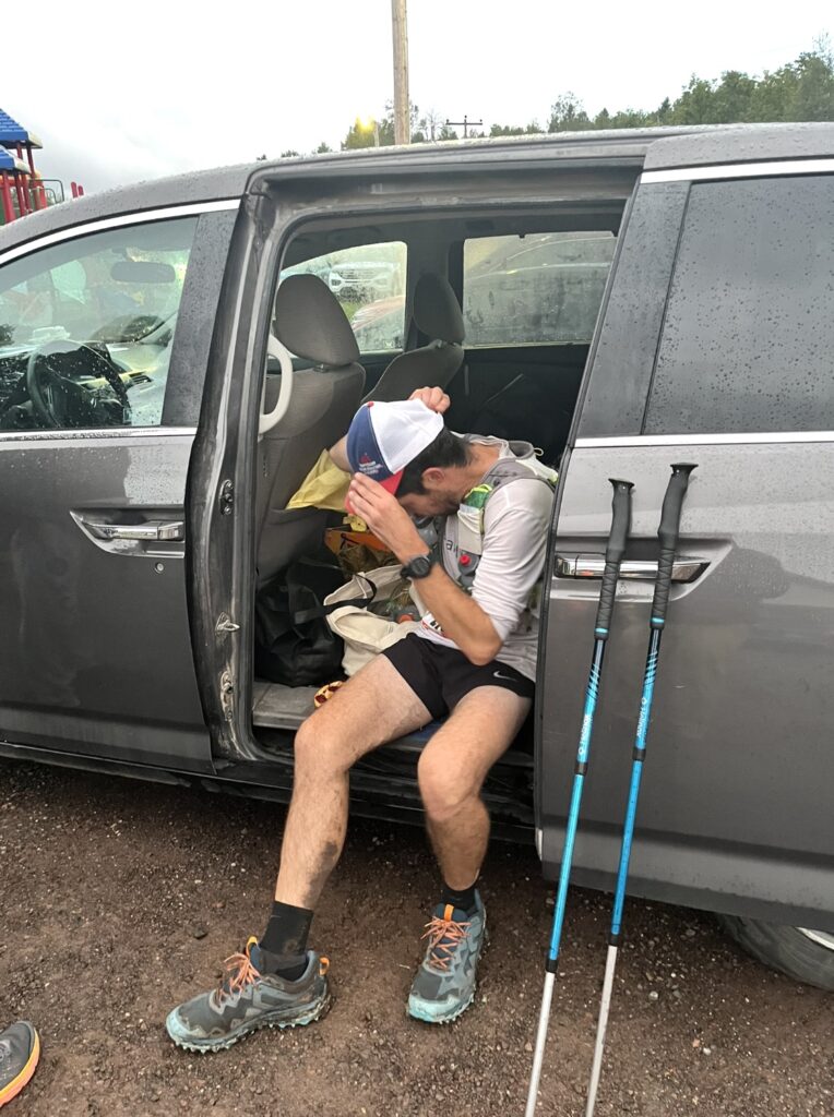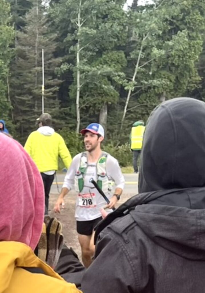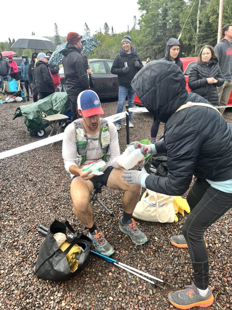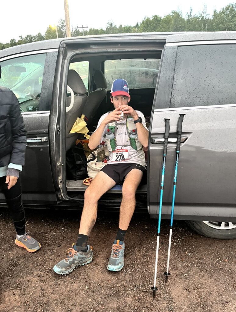 People came and went. I chatted with a few people, like Jeff out of Silver Bay. I asked what his goal time was. He said 26 or 27 hours. I didn’t know how to verbalize my follow-up question without sounding like an asshole, but I questioned if his plan was to run this fast this early. I couldn’t understand how the race was starting off so fast. 20 miles went by like nothing, and I had a lot of fun trying to keep it cool and easy while talking with lots of racers. My fueling strategy was right on, and I was excited to see my crew. During the final mile or so into Beaver Bay, I ran by myself after being surrounded by people and yapping for hours. I could sense the aid station, saw a volunteer or spectator, turned a corner and saw the unmistakable mark of a Superior aid station. The HAM radio operators were seated first, a few volunteers with flags, then the road, then a massive horde of people.