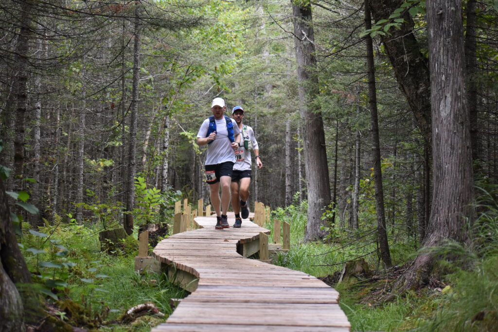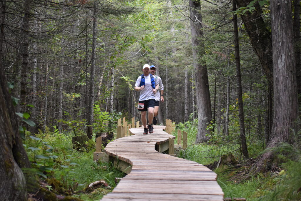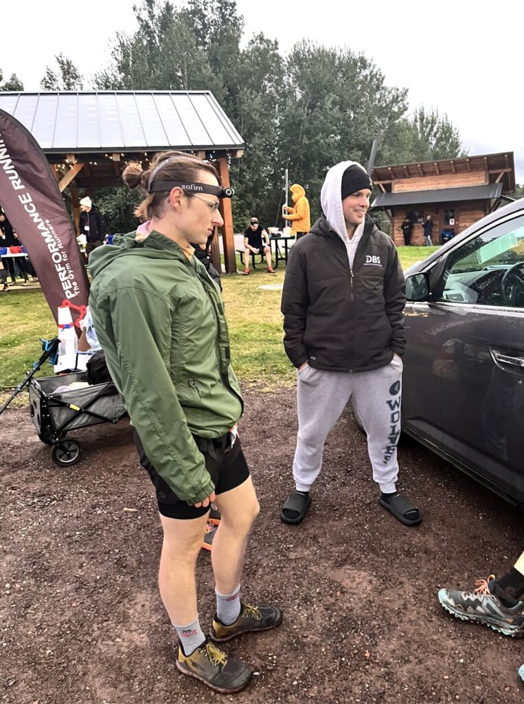 I easily found my chair and noticed a few other crews or racers hanging out at the aid station. I sat with my face in my palms, just hating life, as Ryan and my crew discussed my withering away. He said I need to eat, and I disagreed, telling him and my parents that I was done with the food. I ate a pancake with syrup and a small piece of bacon either way. I got my bottles filled up, and it was unbelievably nice to switch shoes. They touched different parts of my feet and lower ankles that were uncomfortable, but the relief on my toes was absolute and noticed right away. I changed my long sleeve tech shirt for essentially a fresh replica. I set off with Andrew after thanking Ryan, and bolted into the woods. He seemed a little surprised right away because I was running strong through the buffed out, wide and flowy trails alongside the west side of the Temperance River. I told Andrew I just wanted to run it in. I felt confident that I’d be able to run. I was running. I just had to dig deep and really want to do it. I asked him to just keep me running, and we set off into the night.