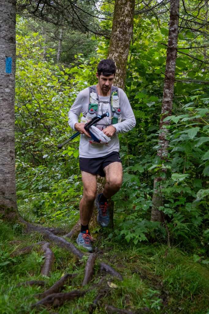 I enjoyed running many miles with Tyler right behind me – I could control the pace the way I wanted to run and he seemed fine with that. We didn’t see any other racers throughout the whole section. Maybe one or two but it seemed like Tyler and I were in no man’s land. We shared some miles in silence, just chipping away. We climbed up to Sawmill Dome, saw local race photographer Tone and I yelled at him about the upcoming inline skating marathon. I figured we were a mile away, and Tyler and I talked extensively about GPS mileages on our watch. His watch showed almost exactly 0.5 miles more than mine. I told him that we just lock in and hold 4 miles per hour strictly, and we’d have a finish time in the 23s. I stopped to pee thinking that the aid station was right around the corner. That’s what I told Tyler… but realized shortly thereafter that I was wrong and it was probably another mile before I got to County Road 6. I ran it in feeling great. As evening seemed to be setting in, the sky was certainly darker but due to rain. Similar to the majority of the day, no real precipitation was falling but we were essentially in a cloud. Fog seemed to present and a fine mist was spraying everyone outside whether they wanted it or not. I liked it. When I got to my parents, they didn’t seem to be liking it. All the crews, volunteers and spectators were bundled up with puffy jackets. I sat down in a chair. Local ultramarathon racer, coach and race director Eric, who was not racing this day, told me Shannon was 2 minutes up from me and cheered me on with some words of affirmation. I grabbed two bags of mix to refill my backup stash in my running vest, then two more baggies to throw under my hat. I took some sips of water at the aid station but didn’t do or say much more than that before running off to cheers from the crowd. I couldn’t run or even really walk out of the aid station and fill up my bottles with mix at the same time. I told a passing racer that this was the slower way to do it. He agreed with me. I told myself I’d stop doing this and have my crew or someone fill up mix for me. I saw my friend John taking photos. He was set to run the 50 miler in just a handful of hours. A hundred feet behind him was his partner Danica. I quickly took my cap off, grabbed a baggie and held it out, “just like my cocaine days!”, thinking I was hilarious. Besides taking so long and having to either walk or stop completely, when I’d try to fill up my mix I always spilled white powder all over my hands and the bottle itself. The pure sugar mix made everything sticky. Luckily, the leaves were nice and damp and I always had nature’s wet-nap nearby.