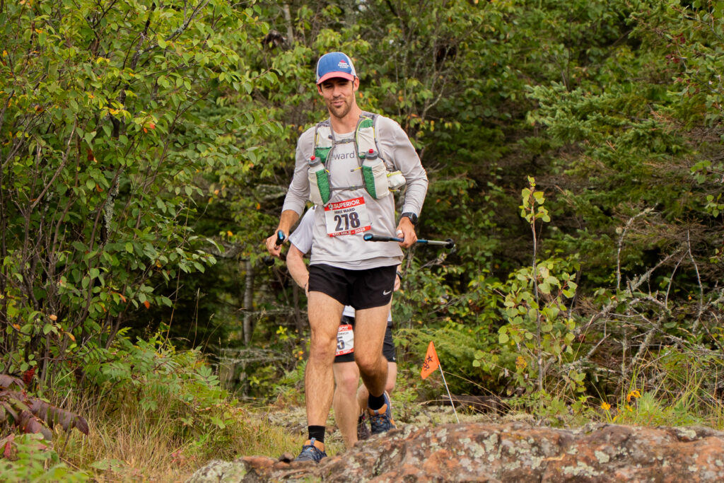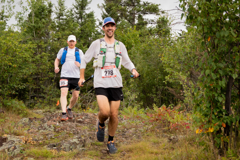 Leveaux came and went, we finally made it over the Onion River bridge. I felt unfamiliar with the section but before long, it was the glorious last aid station at Oberg. I was so excited to get there. I knew it was the home stretch and I’d be able to smell the finish line. Oberg is special. It’s so hard, but you find an extra gear out there. I was excited to attack Moose Mountain and Mystery Mountain and show my brother what Superior was all about. We came up on my dad and I didn’t even sit down. I told him I just wanted to fill up on water. I was fast – in and out. I logged a couple 13 minute miles through Oberg and into the final section. I passed the guy in tights. He kind of stayed right there. I’d make a little time and was moving fast. One little hill and I couldn’t run and I couldn’t hike fast and I felt like I was just floundering. The tights guy passed us up and I felt like there was no way I’d catch back up. I told him that, he said I would. His pacer wasn’t with him any longer. I tried to keep up. No go. Oh well. I was kind of ambivalent at this point. I didn’t really care about my place, my time, or anything. I didn’t care about my body. That thing was fucked. I’d just walk so slow, moaning and groaning. Andrew was probably unimpressed by my lack of urgency. He had a long drive ahead, I wasn’t unaware of that fact. My emotions and energy would shift sharply. I told myself I could still get under 26. I picked it up and ran. I wasn’t super excited to be running trails – I felt pretty defeated in all ways, but was able to move pretty well looking forward to Moose Mountain. I didn’t feel like we were headed the right way, but figured Moose was bound to be right there. The section was, like, 7 or 8 miles? We were a couple miles in. It was, like, 3 miles on top of Moose, then 3 miles up Mystery and down the damn finish line. Despite feeling disoriented, the climb was unmistakable and we hit it. Andrew made it to the top much faster than I did. I had no zip, no power on the steep and punishing climb. I was so gassed when I got to the top I just wasn’t able to run. But, I pushed off on my sticks, yelling “YAH” and lurching forward. Luckily, my feet followed suit and started churning. I was still running. But, I couldn’t do it. I had to stop. I stopped running and Andrew went so far ahead. I walked slowly across the top of Moose Mountain and when I’d see Andrew from around a corner stopped, he’d keep moving forward as if I had a reason to go chase him. I was so tired. I thought it might be funny if I just laid down on a rock. I found a perfect boulder and just slumped over it. I saw Andrew look back, we weren’t saying much to each other. I knew it was of no benefit to not be moving forward. This was the home stretch, I reminded myself. I got up, started running, and felt rejuvenated. Maybe I should have continued to focus on taking in carbs, I wondered to myself. I thought I saw a race photographer in the distance but it ended up being a stump. I was looking forward to the recognizable descent from Moose Mountain. Up and over Mystery is the true home stretch. I could smell the finish. I thought of stories I could tell Andrew from duking it out down Moose and up Mystery over the years. I was too tired to start the story. I remained silent, besides breathing loudly in through my nose and out through my mouth, sprinkling in grunts and winces of pain.