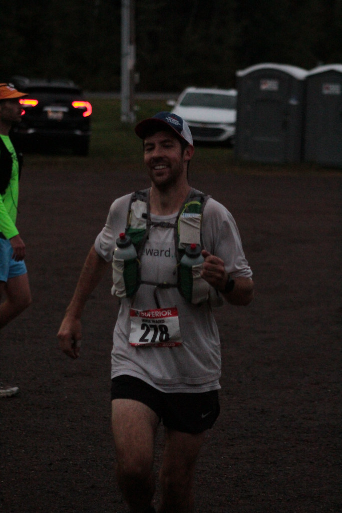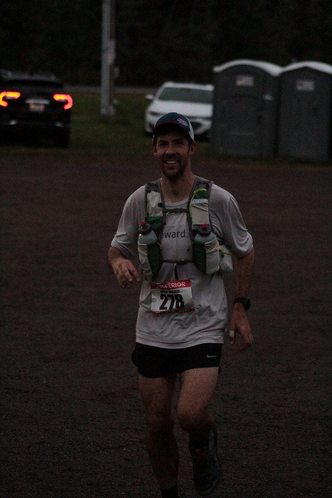 Approaching aid stations in the night at Superior is a uniquely special experience. You hear echoes in the distance, flashes of light, whiffs of bonfire smoke, you know it’s close. Sometimes, you’re wrong. You see the HAM radio operators and say the same thing “278 comin’ thru!”. Then you see your concerned looking crew and a glorious folding stool. Once I sat down at Sugarloaf, Justus reminded me right away to get my jacket on to stay warm. I asked about my shoes. They didn’t have them but would bring them to the next aid station. I ate a small amount of food and everyone was recommending I take food along with me and eat it. I was getting kind of whiny – the bag of chips I had was way too full and it wouldn’t fit in my running vest, I figured. I demanded a smaller bag. They gave me some needed tough love and told me it’d fit just fine and to eat the chips. In fact, I could eat the chips to reduce the size of the bag. My bottles were refilled with water and the mix. My mom was trying to get me set up with the bottles and pack and helping with my jacket. Her hands trying to fix things as I was trying to do my own thing resulted in a short-fuse freakout moment and I yelled at her. I said “MOM”, looked her dead in the eyes and firmly requested, “STOP fucking with my shit!”. Ryan said he would never get away with talking to his mother like that. Ooops. Gah. Whatever. We gotta go. Sugarloaf was a mere pit stop. I got my bottles back and loaded into my vest, I had a mouthful of food, I thanked my crew and Justus and took off with Ryan. I had to walk for a bit as I ate food and organized my life. I got the recap from Ryan on how he got up the shore, what the crew situation is like, and some other types of quick news. We started running before too long and it was just right back to it. Keep doing the thing. It didn’t take long for frustration to set in. I was reminding myself that the section was runnable, but frequently giving up to walk with a powerful pole technique to propel me forward any time it seemed too steep or too technical or too high of a tree to jump over. My body was feeling the compounding damage from the day and Ryan reminded me to eat as much food as I could. I wanted to tell him to shut up – I was so done with food. My drink was still fairly tasty. I was convinced I was drinking enough and promised to Ryan that that was the case. My wrist was getting irritating from poling in a repeating motion for lots of hours in a row and I could feel a tendonitis-type issue forming. My hand blisters were beyond gone and I knew they were going to be gross in the future. But, for the time being they were just the hands I had to deal with. My feet were getting tired and I could feel various tender areas on my ankles and knees. My hamstrings and quads felt fairly beat up. My mobility was hindered and I felt reduced to a shuffling run or fairly strong power-hike. But, the power-hike speed was not enough to clear 15 minutes per mile, let alone factoring in aid station stops remaining. There were so many trees down. The Sugarloaf section seemed so unrunnable at night, with a grinding slight uphill, roots, overgrown trail and the downed trees. I noticed a couple decent mile splits, and a couple getting too close to 20 minutes per mile. I couldn’t really do math and at one point tried to read my pace chart to see if I was even on for 24 hours any more at all. Ryan told me to not focus on that and focus on eating and just moving forward. Ugh, I just shut up and put my head down. Ryan was telling stories and going on and on about random stuff but I just couldn’t focus on what he was saying, instead drawing inward and letting my intrusive thoughts overtake my focus. I went back and forth a couple times with a runner – Ryan and I would come up on a racer and their pacer, I’d pass with authority then feel depleted. Then I’d spend too much time walking, unable to get into a good running rhythm and could just feel the two guys creep back up from behind. I couldn’t respond and let them go. I had to pee 5 or 10 times throughout the section and it just felt so good to stop for a second and turn my light off and pee. My legs felt so unsteady while stopped. I wondered why all the sudden I was peeing like crazy. Maybe it was my brain tricking my body to stop the relentless grind forward. Ryan said it was a good sign, then reminded me to eat. I told him with a defeated vocal inflection that I was drinking my mix. We made our way just fine, and it was nice to get to Dyer’s Creek, a familiar landmark pretty close to the Cramer Road aid station. I’d be able to change shoes there, I thought, and I just need to keep stopping the bleeding for now. I tried to keep moving and did a decent job of it. It wasn’t fun, though. We climbed up and out of Dyer’s Creek, hit the road, back into the woods for one last jog of singletrack before Cramer Road. With that familiar nearby aid station energy building, we were at the next aid station in a snap. I sat down and changed my shoes, but also had my head in my hands for a little bit, and certainly wasn’t talking much. I didn’t feel like food at all, but took a little bit in my mouth, took some candy in my pack and got my bottles filled back up. My attitude was in the dumps, but we set off before too long and got to running. Right away, I felt my right foot crammed into my Nike Pegasus Trail shoes that I’d run the first 25 miles in. I knew they were tighter than my Mizuno trail, but holy crap, how were my toes so sore? A few more steps and I had to stop to pee again. I thought about turning right back around and getting my bigger shoes back but kept going. It was a mistake. Every step was painful and my middle three toenails on my right foot were very tender. I was either kicking roots way more, or just noticing it with the newfound pain in my toes with my feet squished into smaller shoes. Every time I’d kick a root it was 