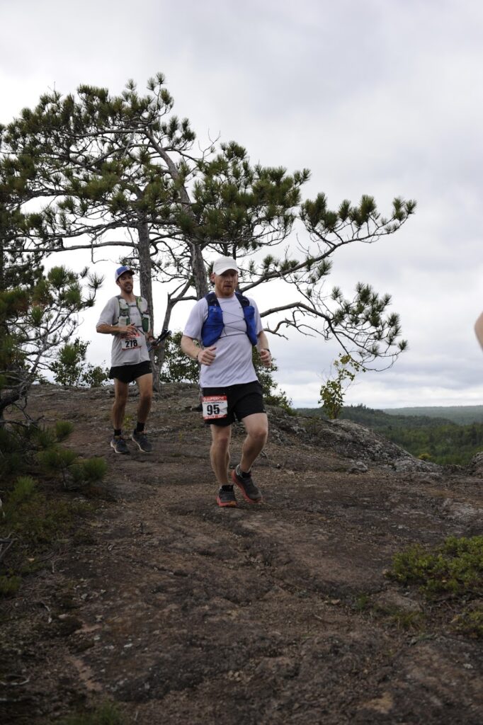 When I got the acceptance email in mid-January 2025, the race seemed so far off. Because it was. 9 months is a long time to prepare, and my preparation came slow. I had zero routine and was exercising very sparsely until the end of February. My main training benchmarks were to be lead-up races – Grandma’s Marathon in June, then Voyageur 50 Mile a bit over a month later. I planned for a big training week in mid-August mainly on the course (training camp) and although my lead-up from February went practically perfect, it was not without challenges. I had a lot of anxiety about injuries, yet was unable to find the routine or time or energy to do strength training. My mileage was OK, but low in comparison to the past, and I was too scared to push it out of my comfort zone. My comfort zone was pretty limited. I was dedicated to trying a new high-carb, liquid-only fueling strategy. Training for Grandma’s went well because I was able to build mileage really consistently and stay injury-free, but it was too little, too late. I felt behind, and slow, all spring. My time was off my goal, way off my PR, but pretty good all things considered. I was proud but not fully happy with my road marathon effort. Voyageur was exceptionally hot and although I struggled immensely, I pretty much only passed people on the back half. My time was way off my goal, but there were relatively slow times across the board and my finish placement was where I’d hoped. Training camp went super well. It was the highlight of my summer, and I was able to log about a 70 mile week nearly all on the SHT. My key workout was a 32 mile/8 hour race pace effort followed by 12 miles as fast as I could the next day through the always-challenging Crosby section. That went about as good as I could ask, but both runs seemed to be lighter than they should have or could have been. After the training camp, I felt very fit. When I was running the standby Duluth Lakewalk it felt like I was floating. I started dialing back mileage, and towards the end of August I felt like I was losing the fitness. Shoot, was my peak too early? It was. Darn it. I reminded myself that I couldn’t really add fitness within two weeks of the race but I could certainly screw things up big time. So, I followed my plan and my intuition and chalked up heavy legs and an average, ordinary first NMTC Fall Trail Series race at Lester Park to taper terrors.