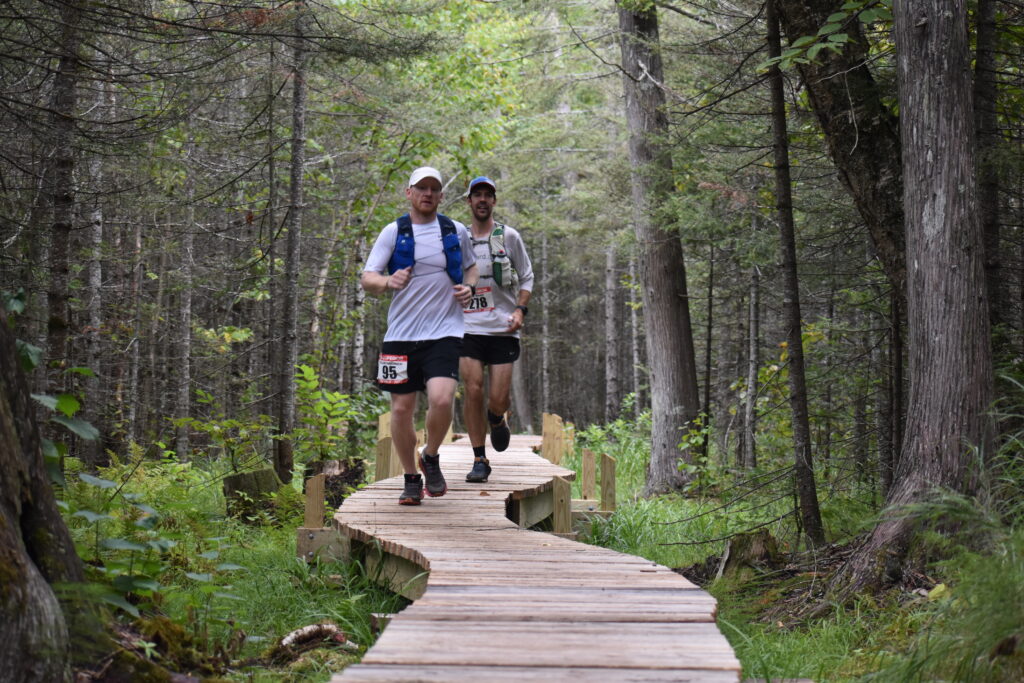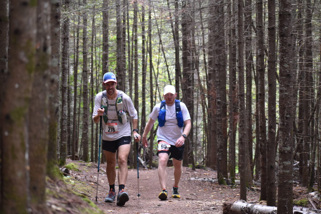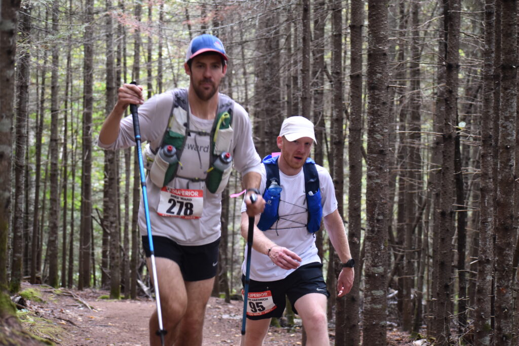 As we ran down to the Manitou River on buffed out, wide state park hiking trails, I started feeling a little uneasy. Physically, I was doing so good. Yeah, I had some tweaks and damage mounting up, but for 100k in, my body was holding up very well. I was well on track for a 24 hour finish time if I was to just hit 15 minute per mile from here on out. I just felt nervous and scared. I kept thinking about the night stalker, coming up on racer after racer just as I’d envisioned early in the race while getting passed repeatedly. We passed a few people around the grueling climb out of the Manitou River and my mile splits were high from the aid station stop, big climb, then just hard to get into a running rhythm from there. 16 minutes, 16:55, 17 something. I was logging slow miles around Horseshoe Ridge and starting to feel depleted coming into the Caribou River area. It was so muddy and overgrown and there were so many slippery roots. I couldn’t run it. How could anyone? A runner and pacer passed us and I couldn’t respond. Justus reminded me to eat and drink, but I knew I had to conserve my liquids for the exceptionally long section. I ate a pack of fruit snacks. I didn’t want to eat. I wasn’t hungry. I was having trouble running and had Justus switch from behind me to up in front in hopes that he could better dictate what was runnable. It seemed to work well and I tried to think about shutting my brain off to just follow him. I had a hard time keeping up to him as we crossed over the Caribou River and headed back up out of the river gorge. The rushing river pounding the rocks 50 feet below the bridge was an ominous noise. I wondered what I’d do if my trekking pole slipped out of my hand and fell down the gorge. It was a grind completing the Crosby section to Sugarloaf, where I’d drop Justus off after 22 miles and pick up my middle pacer Ryan. Ryan stepped up last minute to run a 12 mile stretch. It seemed daunting to attack those two sections and still have gas to run in from Temperance. The deep night was unpleasant.