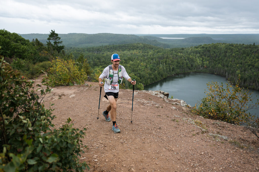 After picking up a couple baggies of mix and putting them under my hat, I ran off and almost tripped over the road with the new bulkier shoes. I was excited to lock in. This is where the actual hills start, I told myself in my head. I promised myself I’d get into a groove of 4 miles per hour. The next mile split after the Silver Bay aid station, mile 23, beeped at 16:30. Nice. My 24th mile beeped at 13:36. A little fast. Feel free to walk, I told myself. I lost Tyler at the aid station and felt alone for the first time all day. It was kind of nice and refreshing to have the field space out a bit. I felt like that gave me the chance to get into my own head and focus, instead of getting wrapped up in a pace line and just floating along yapping away. I hit that mile 24 marker at almost 5 hours on the dot. That meant I was exactly an hour up on my goal pace of 4 miles per hour. That meant that if my mileage was short, and I finished the race with 100.0 miles on my watch, I would be able to do 76- 15 minute miles in a row and finish at 24 hours on the dot. It was time to lock in. The whole day had been a mix between sunshine peeking through clouds, to fully cloudy, lots of wind and some very light mist or fog. Up to Bean and Bear Lake, the mist was heavier than ever and it felt awesome. My core temperature felt very regulated and I was thankful for no extreme brutal heat or heavy rain. The mist was just enough to feel a little cooling on the face, but not enough to actually feel wet or damp at all. At the sweeping overlook at Bean Lake, I was by myself and hadn’t seen a fellow racer for a little bit. I saw a couple hikers and a very cold-looking photographer at the top of the cliff as gusty winds threatened every hat out there. They were in what looked like several jackets, rain gear and had plastic all around their camera. I asked if they were staying warm enough. They were. I was in a great mood, and enjoyed trying to crack jokes to random pedestrians that happened to be out, other racers, volunteers, and of course myself. My bee sting would get kind of itchy here and there but it wasn’t painful or swollen or anything. I noticed my dominant right leg doing most of the work, and a little strain sensation on the upper inside part of my right ankle. I tried to focus on evening that out and putting equal effort onto my left side. I made great time through Bean and Bear.