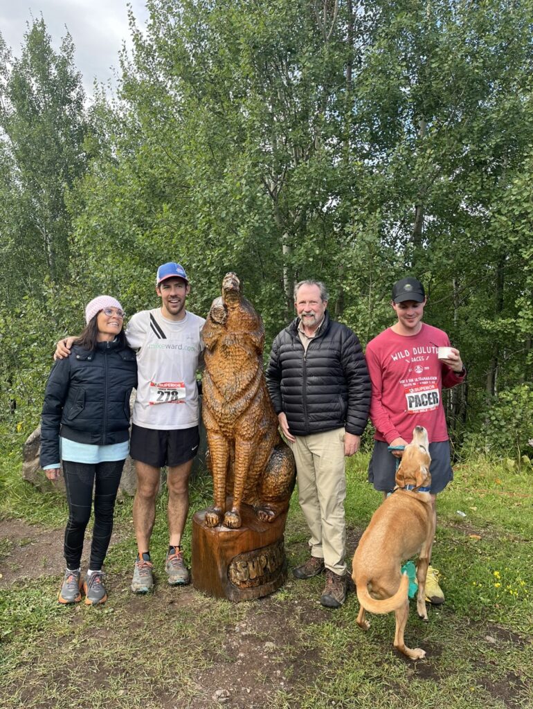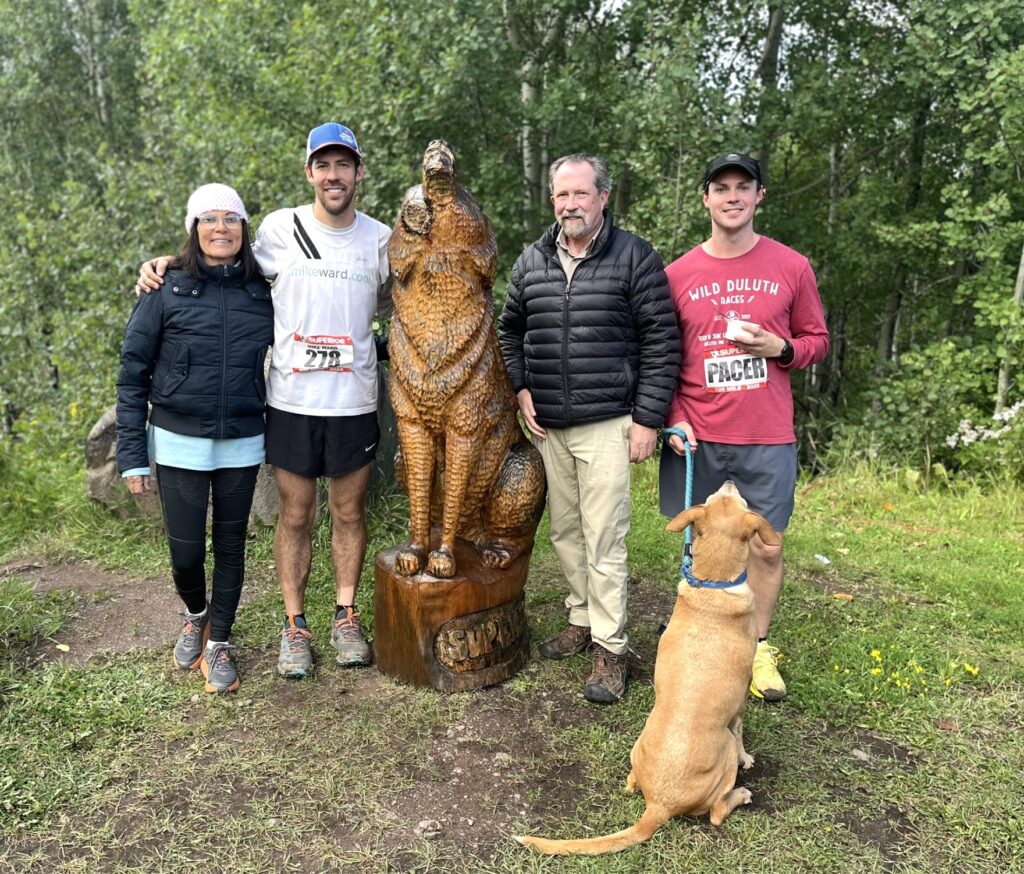 My mom and dad seemed relieved and cheery, as did I. Andrew took right back off to the Twin Cities. Yikes. I expressed to my mom how thankful I was that she was able to be there for me, and I apologized about yelling at her mid-race. I got a little choked up telling her how instrumental she has been in my running journey and the impact she’s had on my life and had to stop with the sappy shit. I slowly and overdramatically got up to take a photo with my crew and the howling wolf.